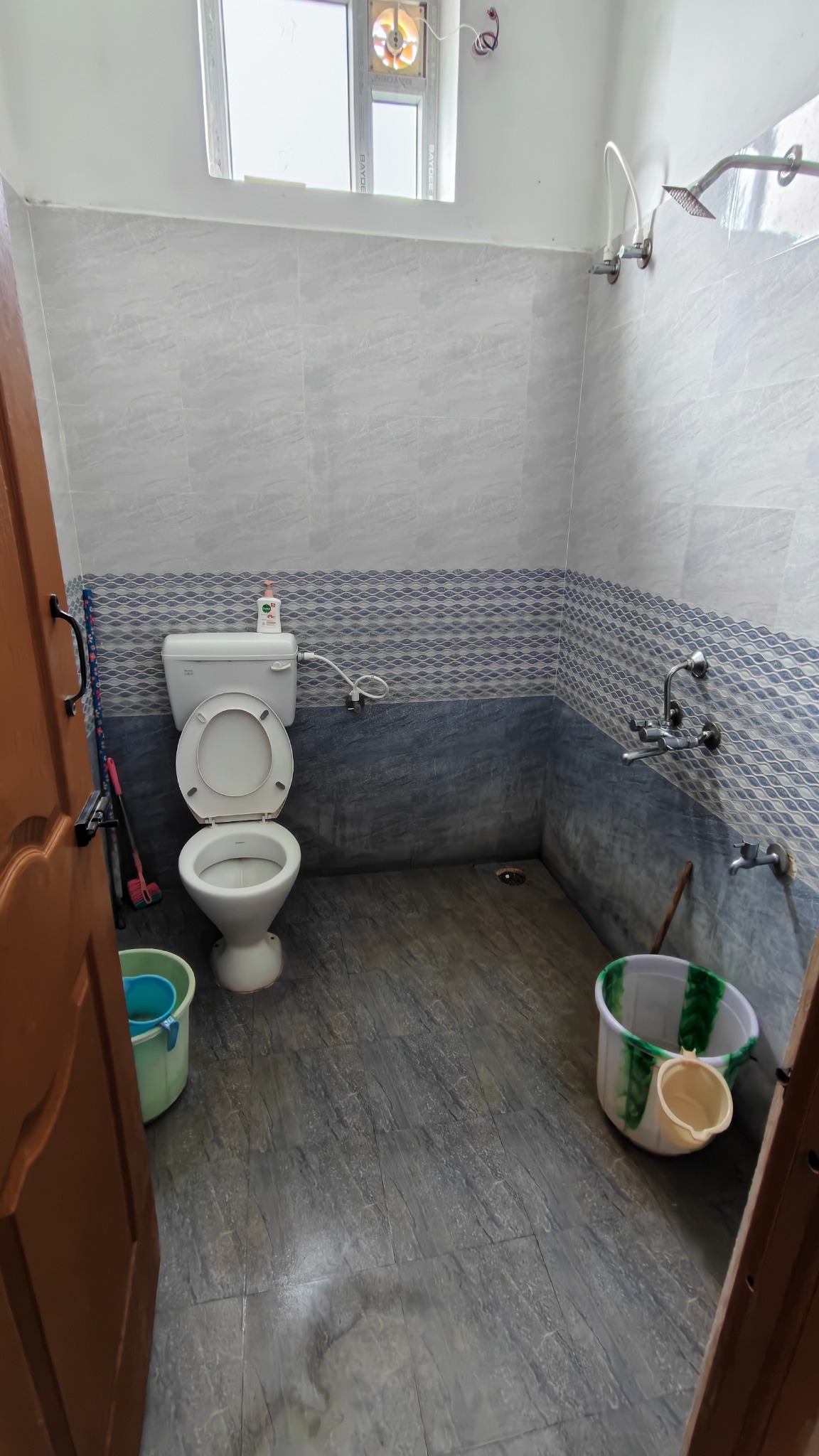 Western toilet with shower, exhaust fan and easy-clean tiles.
